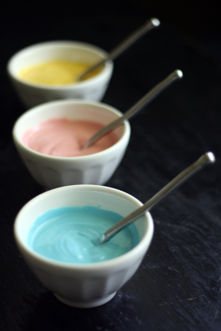 Grab a small spoon for each color and give a good stir to make sure that the chocolate is lump free and smooth.