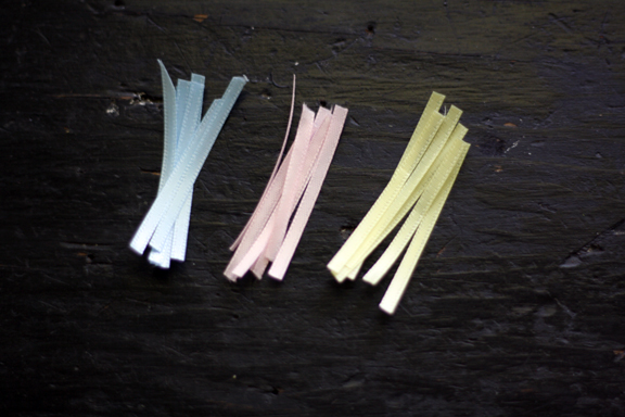 Next, cut your ribbon into two inch strips. These will become the loops from which the darling little eggs will hang.