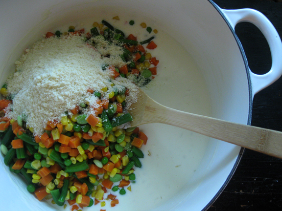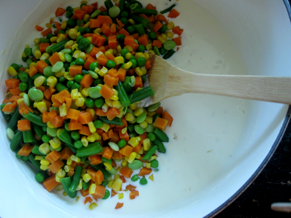 Add in your thawed and cooked mixed vegetables…