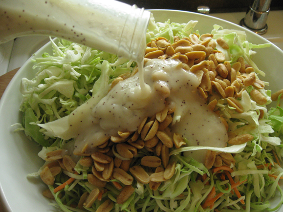 Next add peanuts and pour the whole bottle of dressing all over the top!
