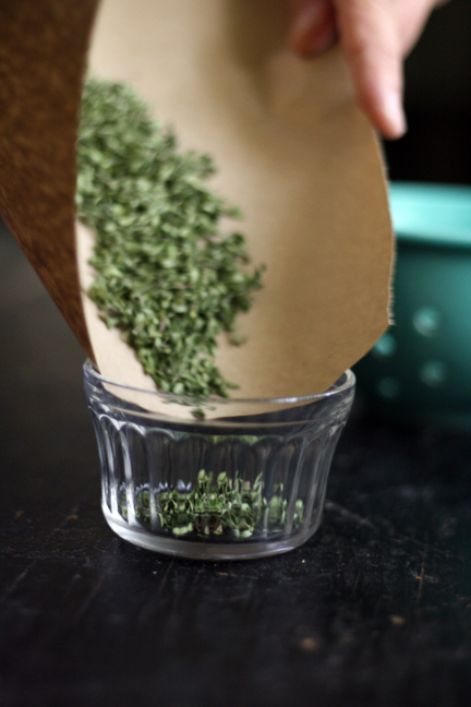 My Yanni began by placing all of the thyme in a bowl, grabbed a piece of butcher paper and gathered the glass containers that would hold the dried herbs.