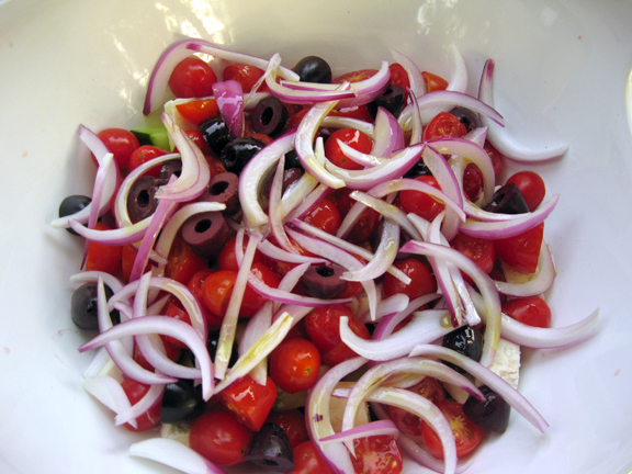 I love to use purple onions for their pretty color and they are mild which happens to be better for my tum. Not to mention they go fabulously with the purplish hue of the Kalalmata olives.