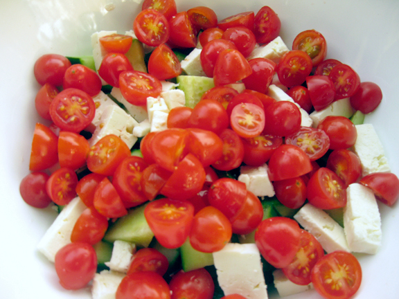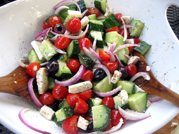 Last week while at the Worthington Farmer’s Market, I bought some gorgeous grape tomatoes. They just pop with flavor in your mouth and are as sweet as sugar. They reminded me of Greece and I just had to make a Greek salad ASAP. I promise you this will become a favorite salad of yours as well…