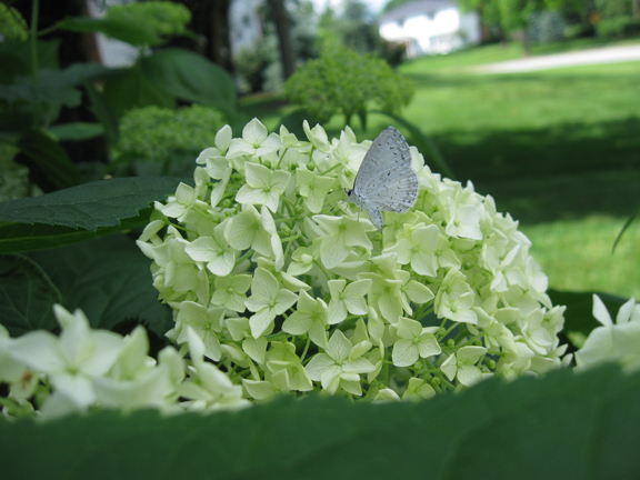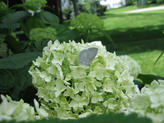 So being the dutiful resolution 2010-carry-outer that I am, I decided to fill my home with hydrangeas yesterday. As I eagerly approached my happy hydrangeas, clippers in hand, I stumbled upon this beautiful butterfly.