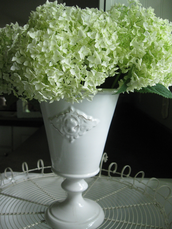 In case you don’t already know this, a hydrangea stem is very thick and fibrous, (woody if you will). It is necessary to trim stems to desired length,then cut the stem at an angle and gently tap the end a few times with your clippers. This will mash the stem a bit but will create better flow of water up the stem. Those lovely blooms love their water. I can’t tell you how many times I had arranged the perfect bouquet only to find them wilted and droopy by morning.