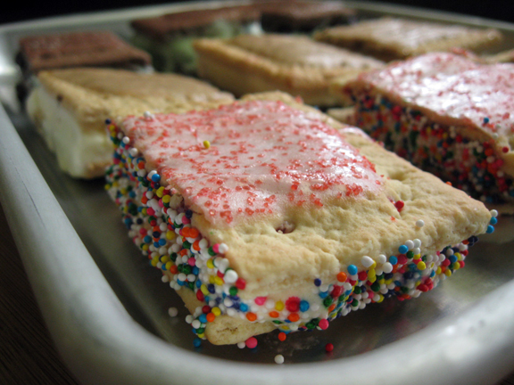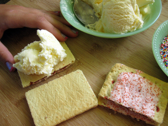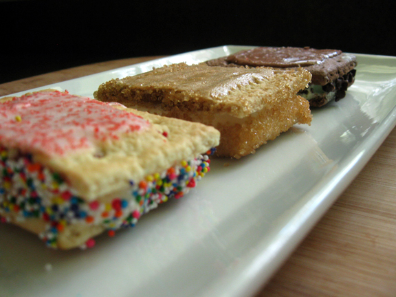 A couple of weeks ago we saw a commercial on TV that suggested the clever idea of squishing ice cream between two pop tarts. We all looked at each other with eyes the size of saucers and said, “we have to make those!”