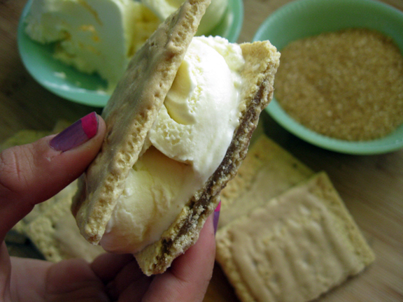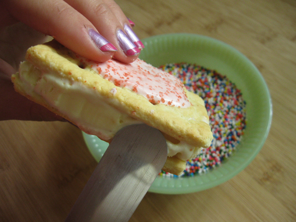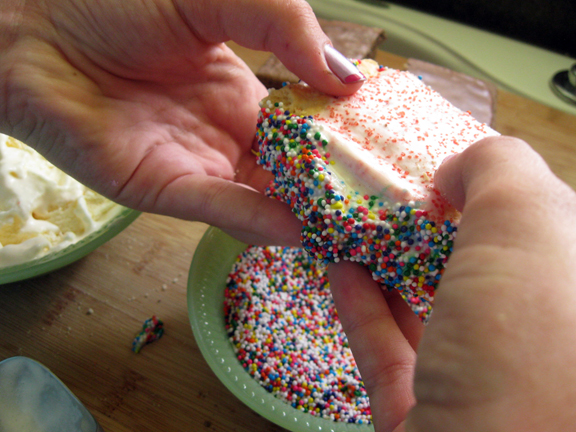Dip the edges of your ice cream sandwich into your sprinkles. Work quickly, the ice cream likes to melt and fast. I found that popping them into the freezer for a few minutes before embellishing the edges helped.