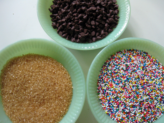 Mini chocolate chips, sugar in the raw and rainbow sprinkles. I think that my inner child has been happily satisfied after making these joyful little treats.