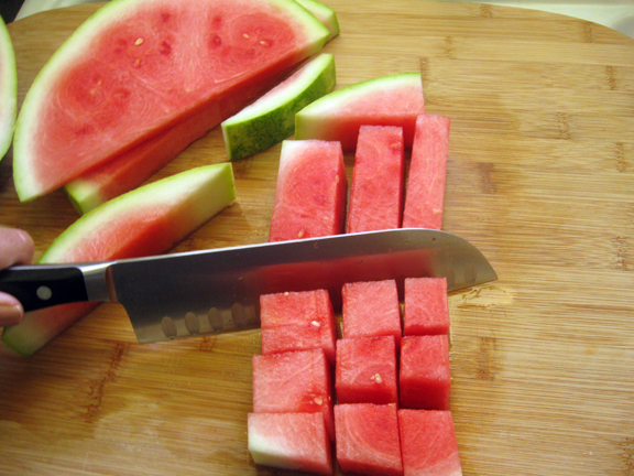 Next, the watermelon. I used half of a seedless watermelon. As a far as quantity goes for this recipe, it depends on the size of the platter you use. It’s always better to have to0 much than too little because my family is always lurking about ready to dive in, therefore the extras come in handy (don’t mess with mama’s stars & stripes).