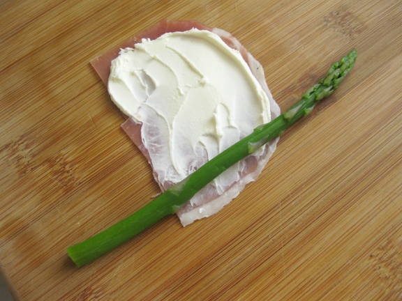 These are the three ingredients: asparagus, cream cheese and prosciutto.