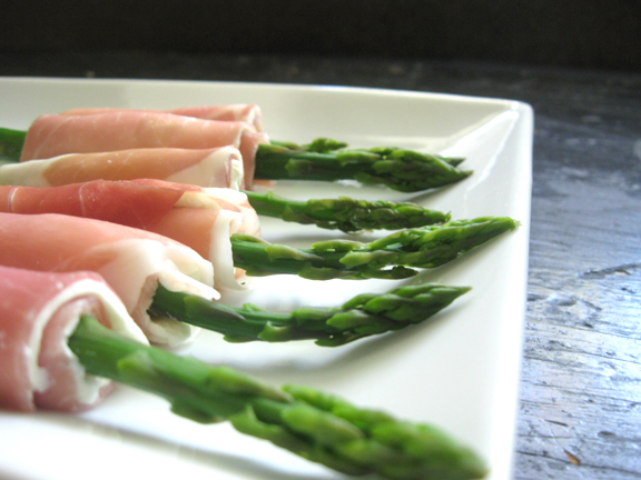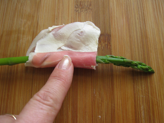 cut the prosciutto into four sections, place an asparagus on the edge, make sure to leave the full tip exposed.