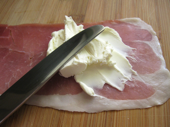 Thinly spread some cream cheese all over a piece of prosciutto,